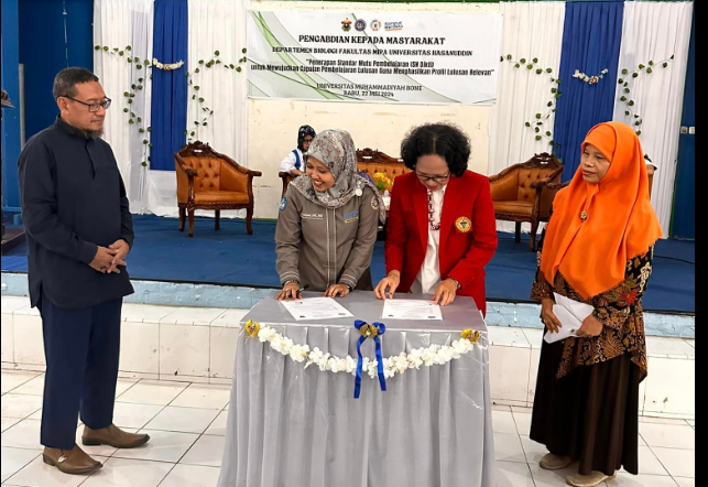 Rabu, (22/5) Departemen Biologi Fakultas MIPA Unhas menggelar Pengabdian Masyarakat Universitas Muhammadiyah Bone. Kegiatan ini dimulai pada pukul 10.30 WITA bertempat di Aula Pertemuan Universitas Muhammadiyah Bone. Dalam kegiatan ini Ketua Departemen Biologi yakni Dr. Magdalena Litaay, M.Sc. beserta rombongannya disambut dengan hangat oleh para Pimpinan beserta jajarannya. Rangkaian kegiatan pengabdian masyarakat ini dimulai dengan melakukan penandatanganan perjanjian kerjasama. Kemudian dilanjutkan dengan perkenalan atau sosialisasi tentang Departemen Biologi beserta profil lulusan Magister Biologi FMIPA Unhas, yang disampaikan oleh Dr. Eddyman W. Ferial, M.Si. Kemudian kegiatan dilanjutkan dengan pemaparan materi tentang Penerapan Standar Mutu Pembelajaran SN Dikti untuk Mewujudkan Capaian Pembelajaran Lulusan guna Menghasilkan Profil Lulusan yang Relevan, yang disampaikan oleh Prof. Dr. Hj. Dirayah R. Husain, DEA.