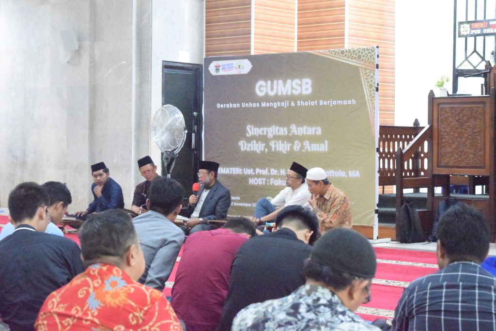 Fakultas Matematika dan Ilmu Pengetahuan Alam Universitas Hasanuddin (FMIPA Unhas) kembali menjadi host pada kegiatan Gerakan Unhas Mengkaji dan Sholat Berjamaah (GUMSB). Kegiatan GUMSB ini merupakan kegiatan atau agenda rutin yang diselenggarakan setiap pekannya oleh Universitas Hasanuddin. Kegiatan ini berlangsung secara luring dan daring, yang bertempat di Mesjid Ikhtiar Kampus Unhas Tamalanrea, Kamis (02/11). Kegiatan ini dimulai pada pukul 15.00 WITA dan dihadiri oleh ratusan sivitas akademika Unhas (Para pejabat, Dosen, Tendik, Tenaga Cleaning Service, SATPAM, dan Mahasiswa) dari berbagai fakultas di Unhas. Kegiatan ini juga dirangkaikan dengan buka puasa bersama bagi yang menjalankan ibadah puasa Sunnah pada hari kamis.