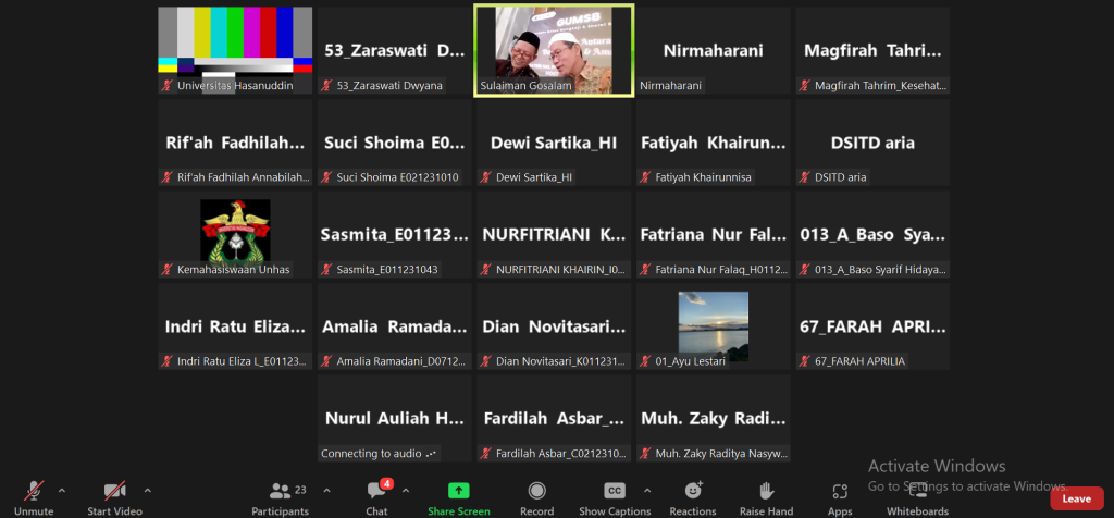 Kegiatan GUMSB ini diawali dengan melaksanakan sholat Ashar berjamaah yang kemudian dilanjut dengan pembukaan ole MC yakni Ir. Edison Sa’de, M. Sc., Ph.D. setelahnya dilanjutkan dengan pembacaan Kalam Ilahi dan Sari Tilawah oleh M. Aris, yang merupakan mahasiswa dari FMIPA Unhas. Kemudian kegiatan dilanjutkan dengan mengaji/Tahsinul Qur’an yang dibimbing Mudarris: Ust. Sulaiman Gosalam (USG) yang di praktekkan secara bergiliran dan disimak oleh para peserta GUMSB.