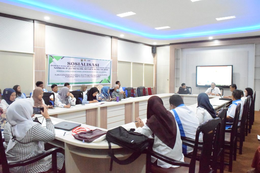 Fakultas Matematika dan Ilmu Pengetahuan Alam Universitas Hasanuddin (FMIPA Unhas) bersama Dinas Lingkungan Hidup Kab. Bulukumba, gelar sosialisasi Peraturan Menteri Lingkungan Hidup dan Kehutanan Nomor P.23/MENLHK/SETJEN/KUM.1/10/2020. Kegiatan ini digelar di Gedung Science Building, Lantai 3 Fakultas MIPA Unhas pada hari Senin (08/01), Pukul 09.00. Sosialisasi ini di ikuti oleh tenaga laboratorium, para penanggung jawab dan kepala laboratorium se-Fakultas MIPA Unhas.