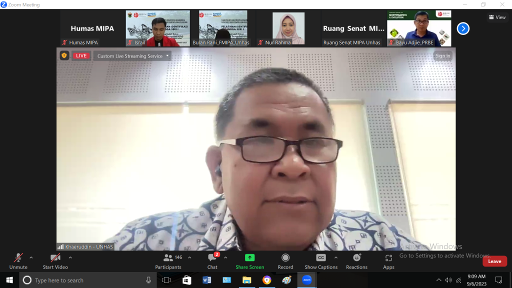 Wakil Dekan Bidang Akademik dan Kemahasiswaan Fakultas MIPA Unhas yakni Dr. Khaeruddin, M. Sc. Dalam sambutanya menyampaikan “kami dari Fakultas MIPA menyambut baik dan merasa bahagia dengan terselenggaranya pelatihan serangga seri 1 ini dan tentunya pelatihan ini akan memberikan manfaat dan ilmu pengetahuan yang besar bagi para peserta. Karena melihat antusiasme para peserta yang hadir melalui zoom ini ternyata banyak juga yang berasal dari luar Universitas Hasanuddin. Kegiatan ini merupakan hasil kerjasama BRIN dengan Fakultas MIPA, yang tentunya harapannya kami bahwa kegiatan kerjasama ini dapat berlanjut ke seri-seri selanjutnya ataupun riset bersama”.