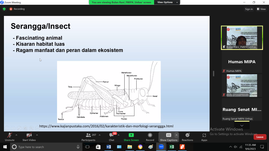 Fakultas MIPA Universitas Hasanuddin bersama Pusat Riset Biosistematika dan Evolusi – BRIN menggelar pelatihan identifikasi serangga seri – 1, yang bertemakan “Mengenal Lebih Dekat Serangga Bermanfaat untuk Kemaslahatan Masyarat”. Kegiatan ini berlangsung secara daring dan luring yang di mulai pukul 09.00 sampai selesai yang bertempat di ruang rapat lantai dasar gedung science building Fakultas MIPA (06/09). Kegiatan ini dihadiri oleh ratusan peserta yang terdiri dari dosen, mahasiswa, tenaga laboratorium, dll dari berbagai universitas dan daerah yang ada di Indonesia.