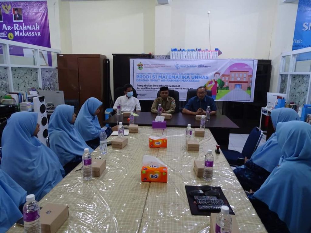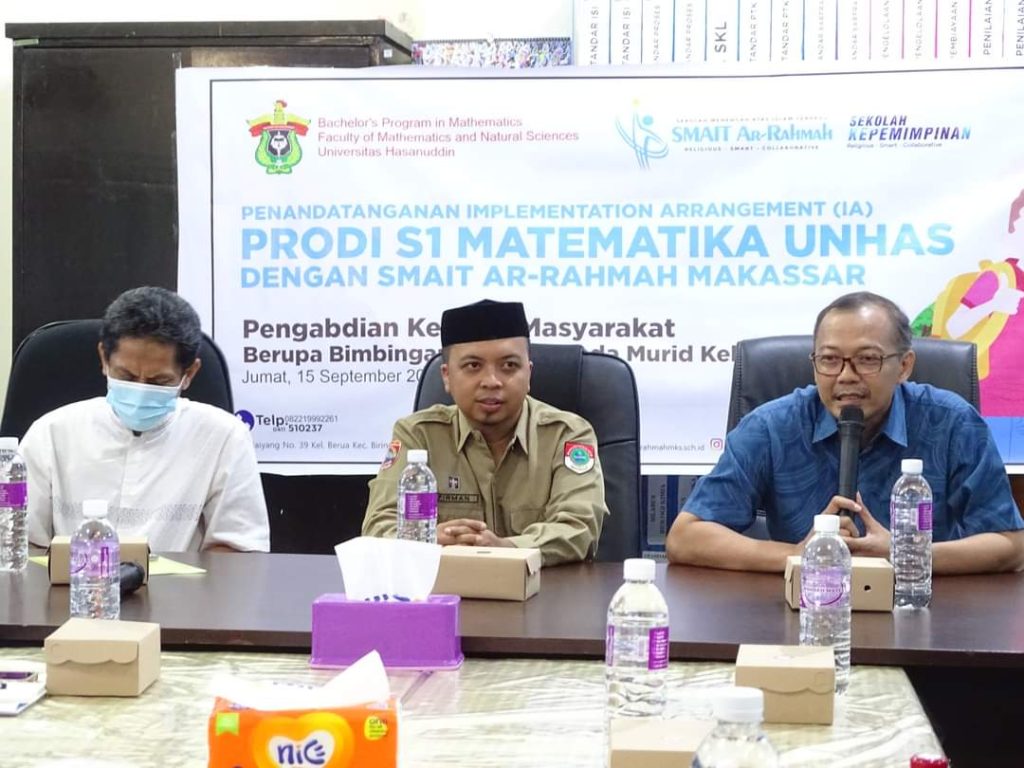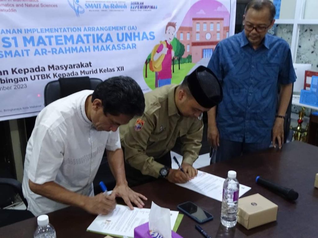 Kegiata Penandatangan Implementation Arrangement (IA) antara SMAIT Ar-Rahmah dengan Program Studi Matematika Fakultas MIPA Unhas berlangsung di ruang rapat SMAIT Ar-Rahmah pada hari Jum’at, 15 September 2023 yang dihadiri oleh Dekan Fakultas MIPA Unhas Dr. Eng. Amiruddin, M.Si., Ketua Program Studi Matematika Prof. Dr. Nurdin, M.Si., Kepala beserta para guru SMAIT Ar-Rahmah. IA ini berisi tentang kerjasama dalam Pembimbingan Siswa SMAIT Ar-Rahmah dan juga sebagai tempat Pengabdian Kepada Masyarakat bagi Dosen Fakultas MIPA Unhas khususnya Departemen Matematika. Kerjasama ini akan dikembangkan untuk program studi lainnya misalnya Fisika, Kimia, Biologi, dan Statistika.